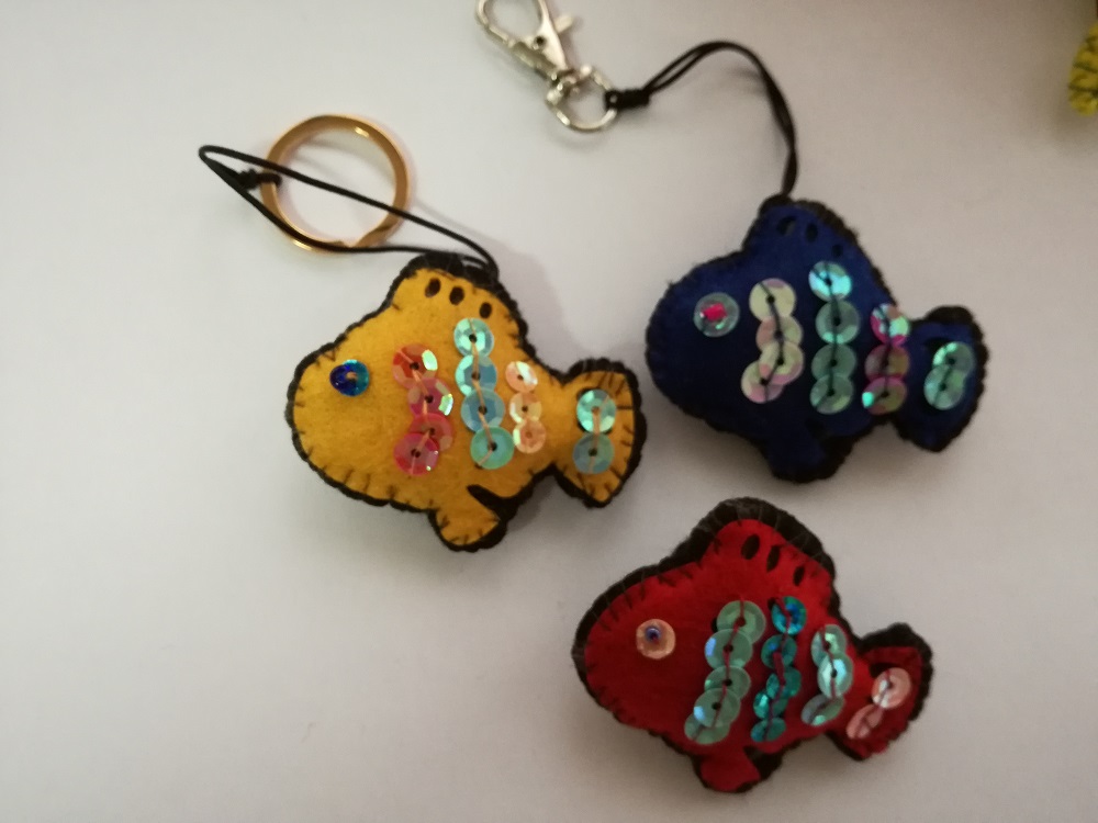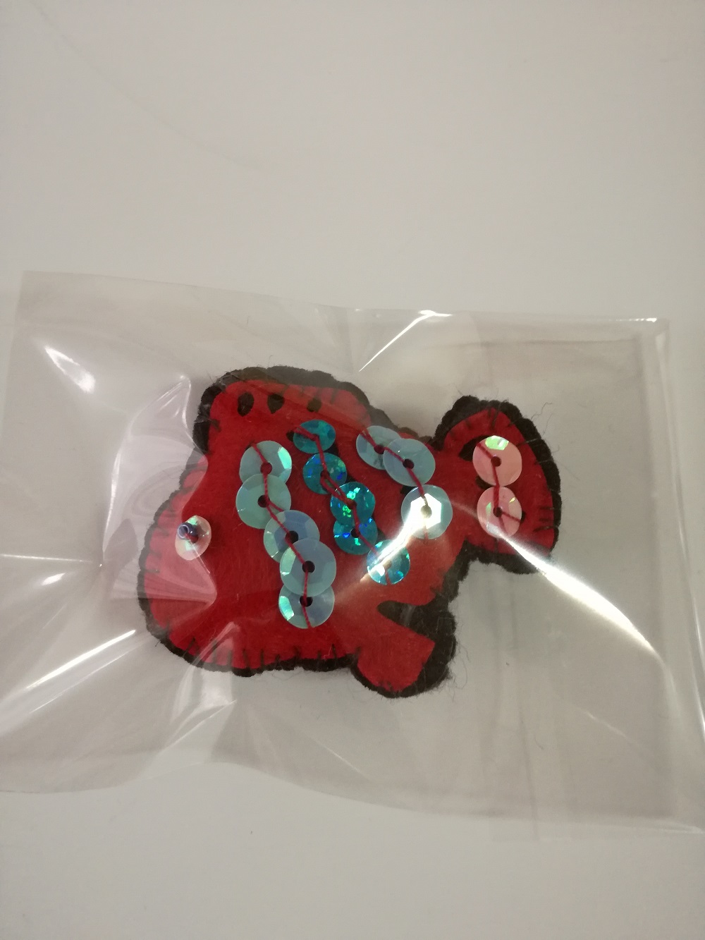 Alfinete em felpo com aplicações em felpo colorido e latejolas