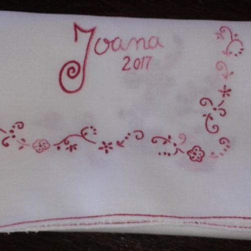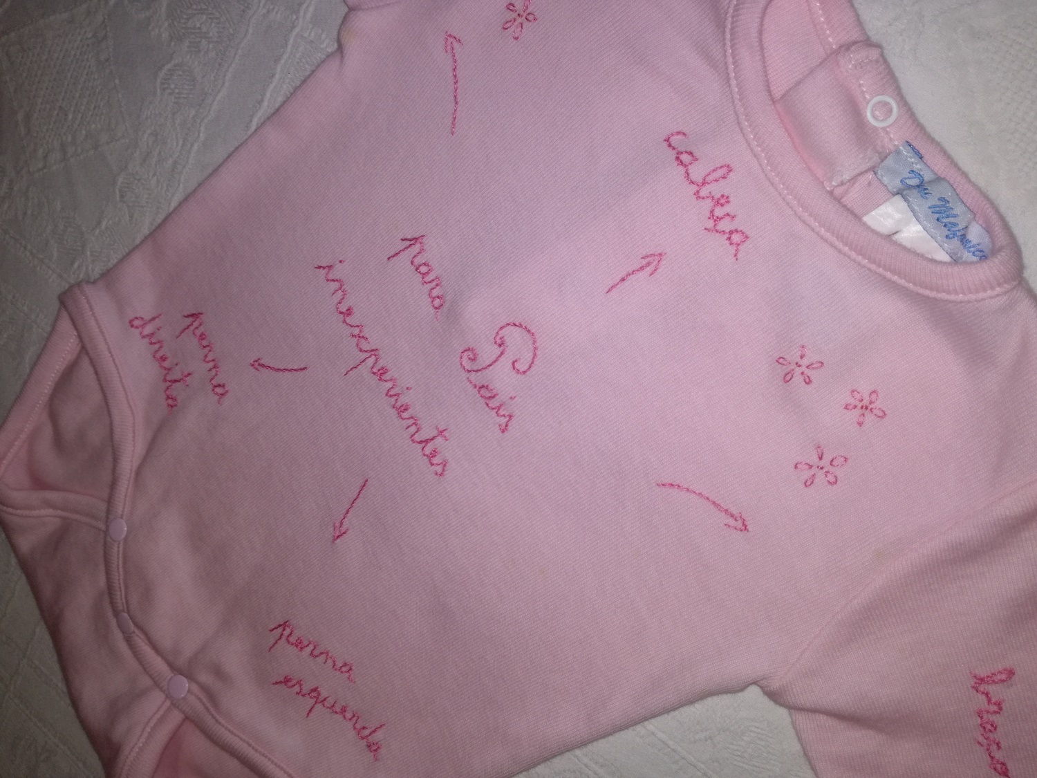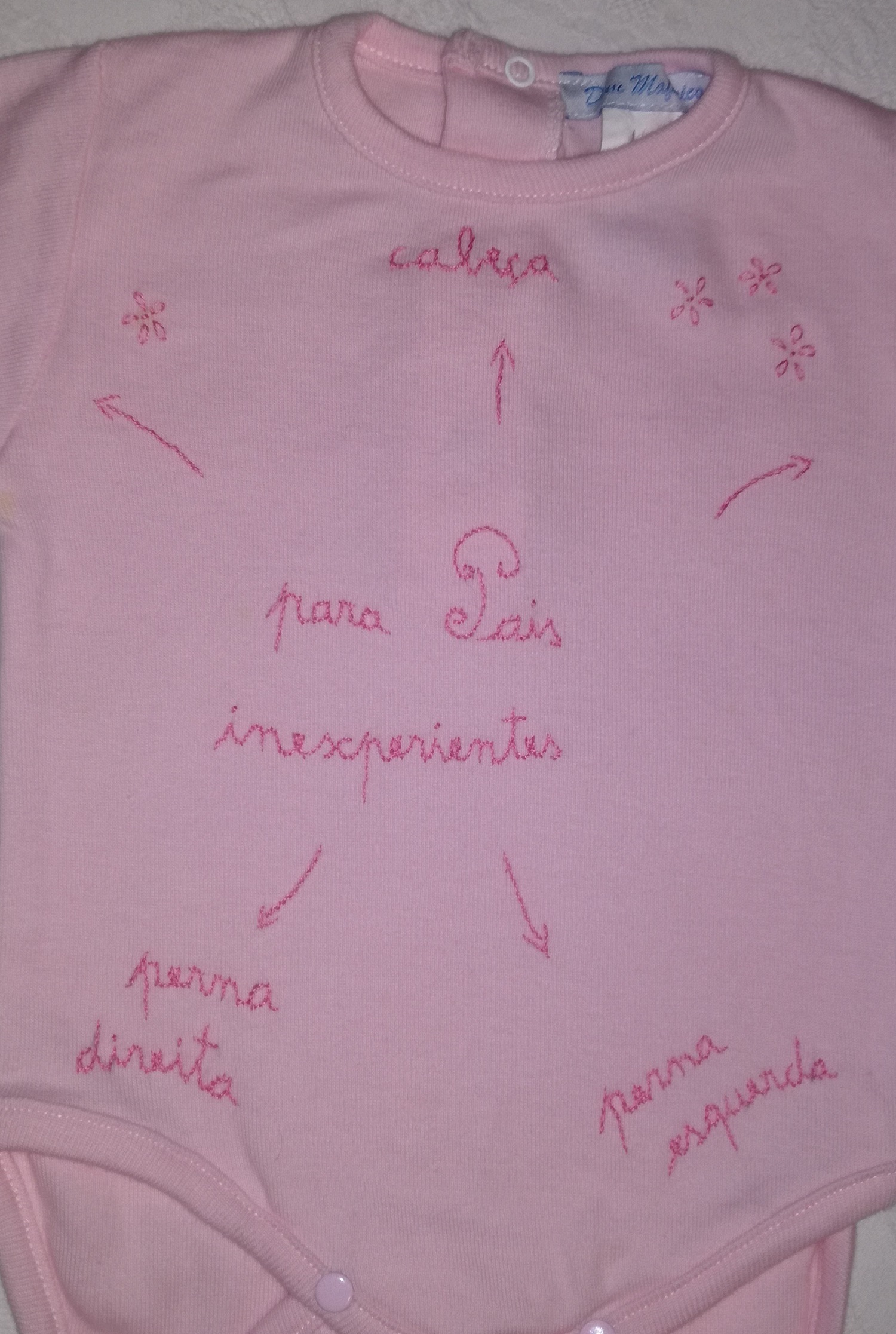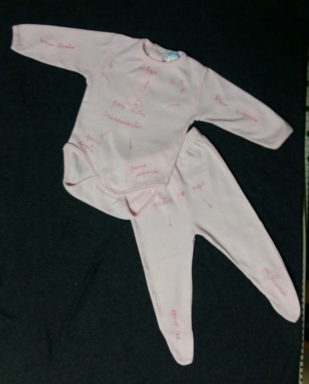 Conjunto body e calça em algodão rosa bordado à mão com linha de algodão