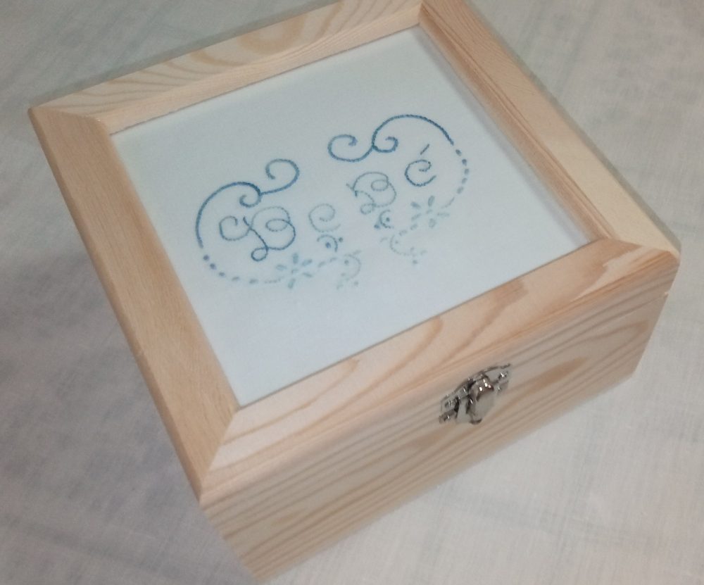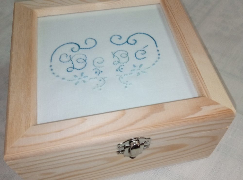 Bordado colorido em linho, em caixa de madeira com tampa em vidro, interior com 4 divisões amovíveis  com fecho