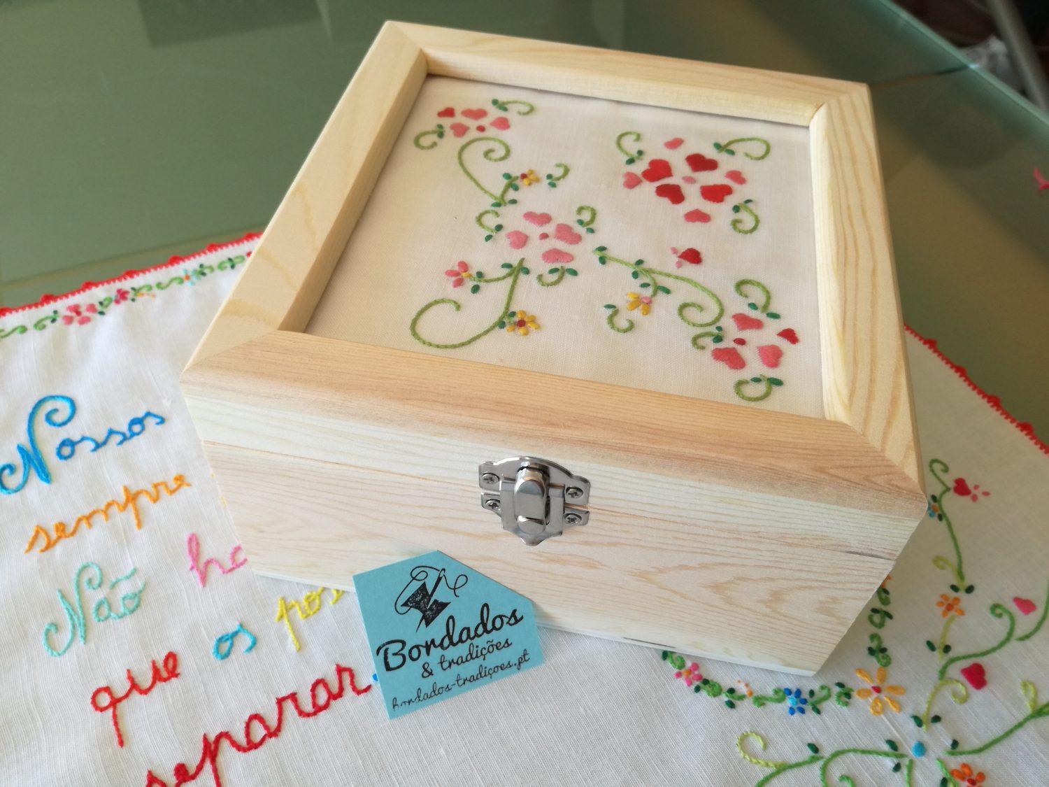 Bordado colorido em linho (marcador), em caixa de madeira com tampa em vidro, interior com 4 divisões amovíveis  com fecho