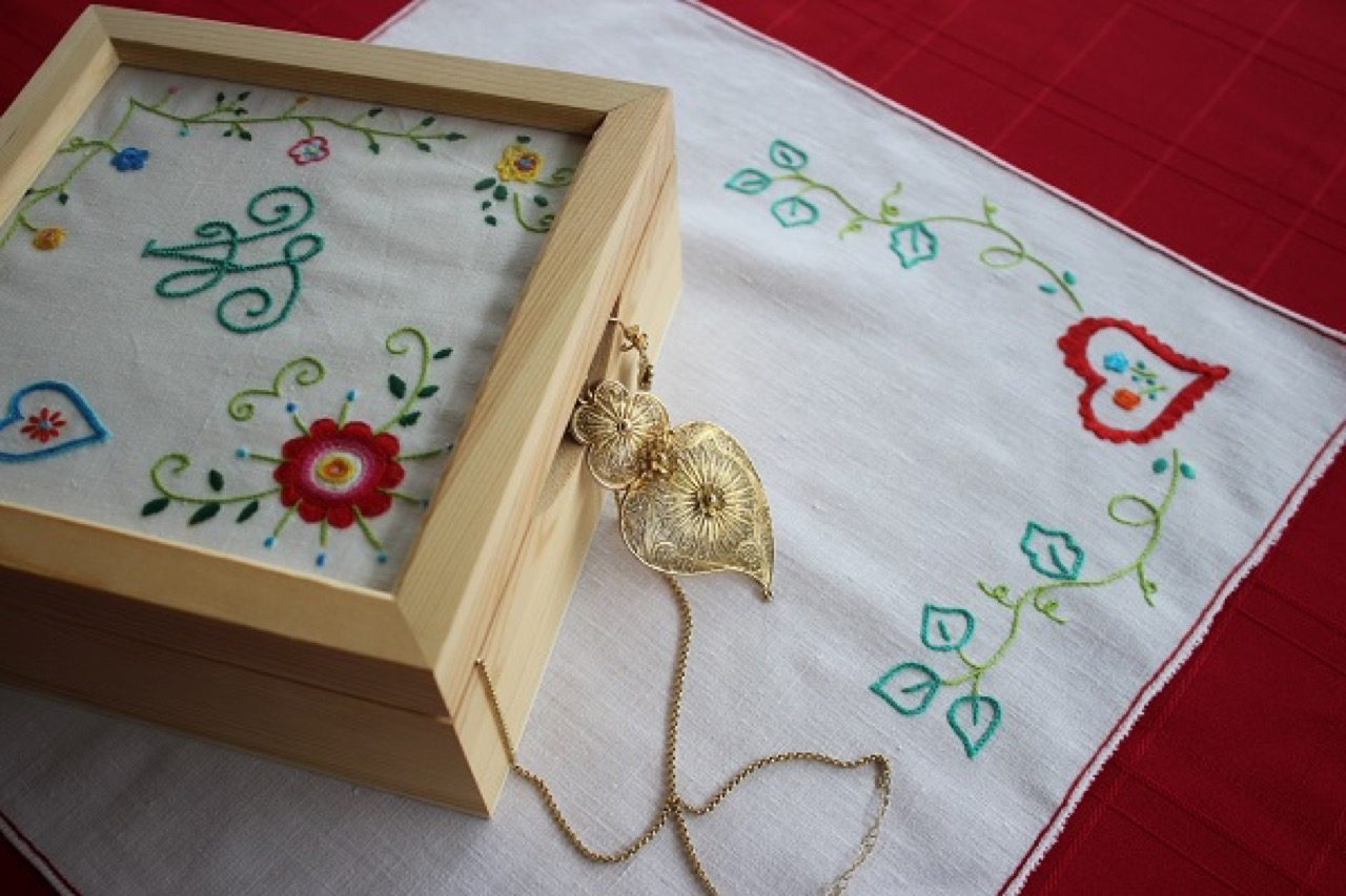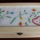 Bordado colorido em linho (marcador), em caixa de madeira com tampa em vidro