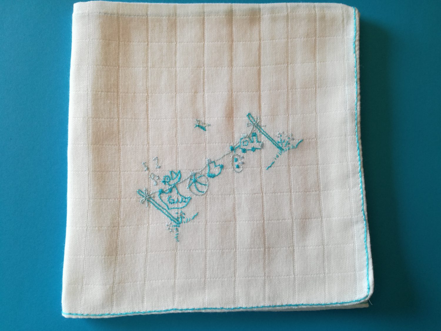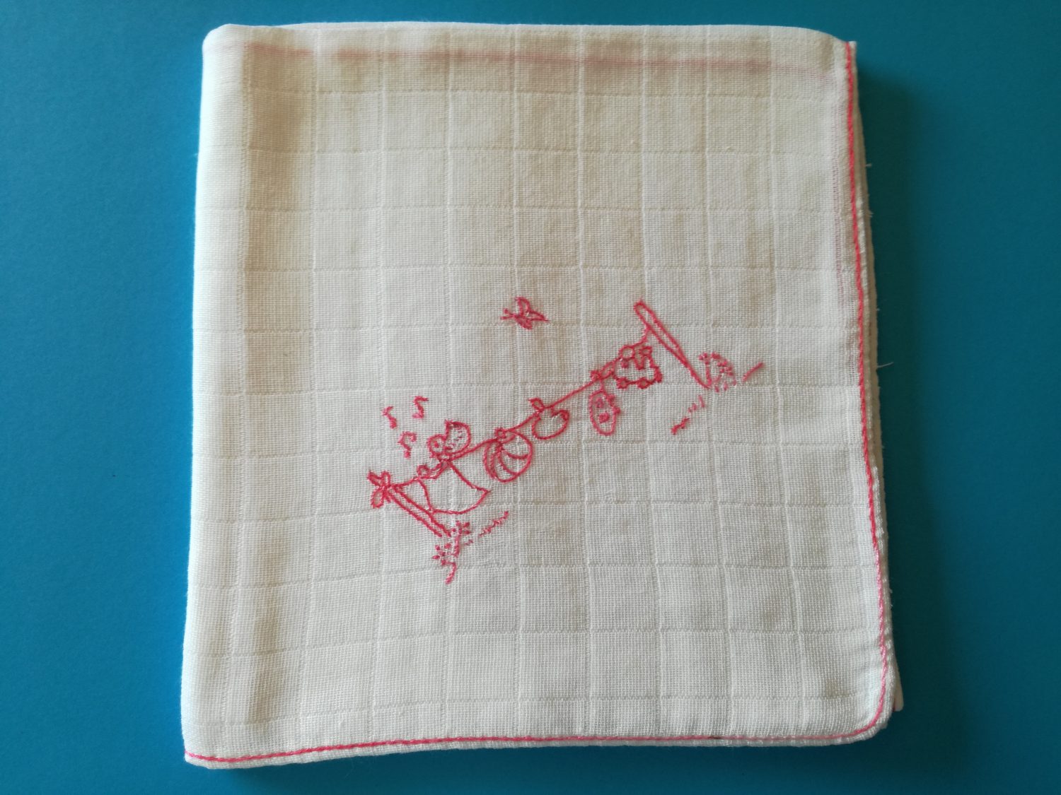 Fralda em gaze de algodão, bordada à mão e remate em ponto pé de flor