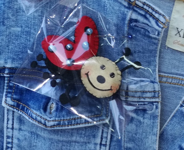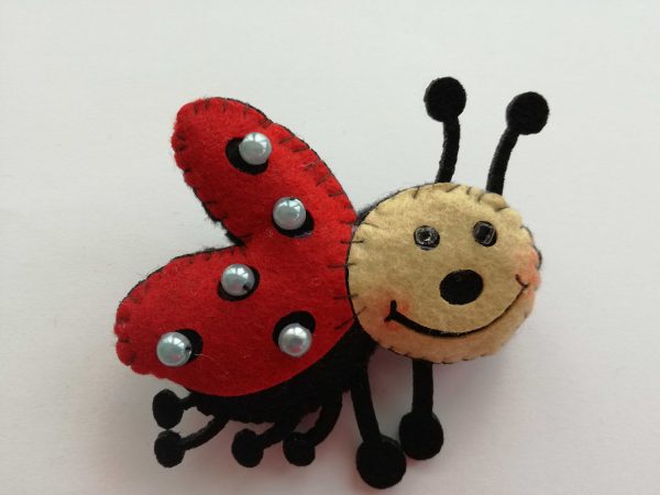 Joaninha em felpo com aplicações de pérolas de fantasia e missangas