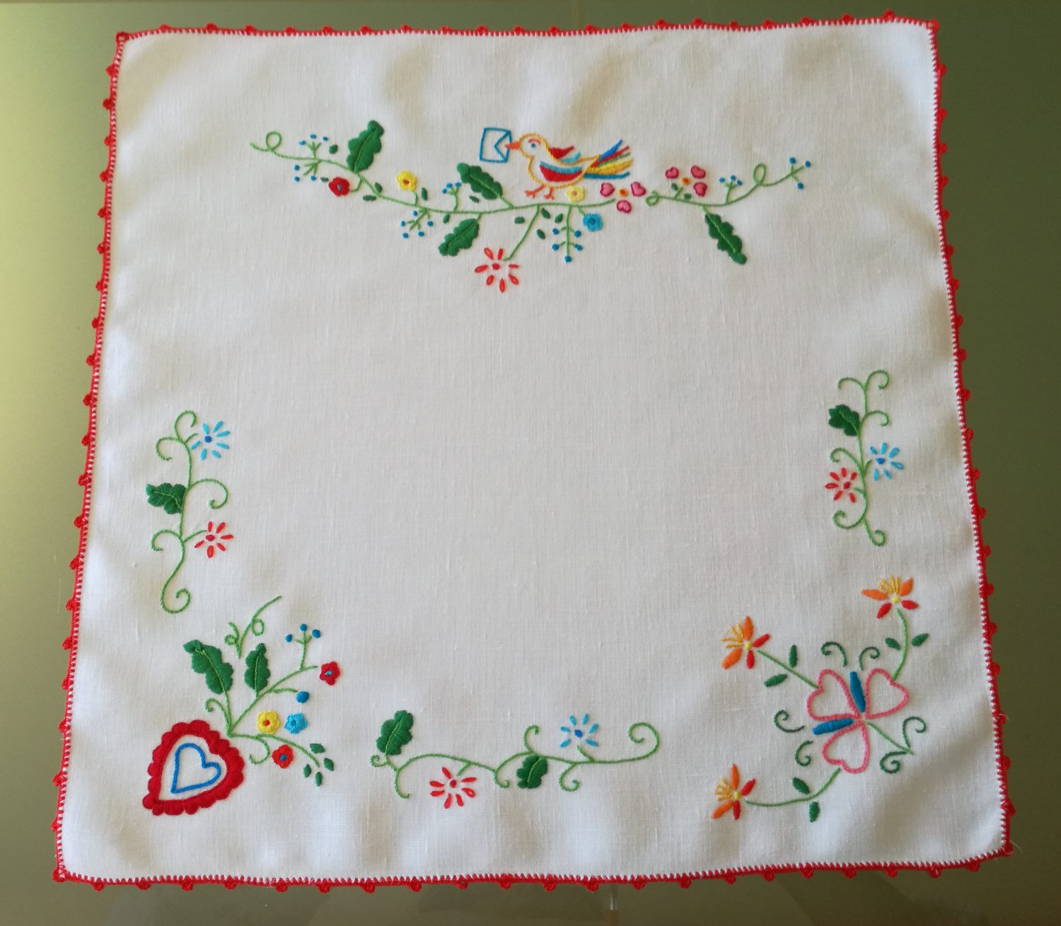 Lenço em pano de linho, bordada à mão, com motivos populares de lenço de namorados com remate em ponto de croché e fio de algodão