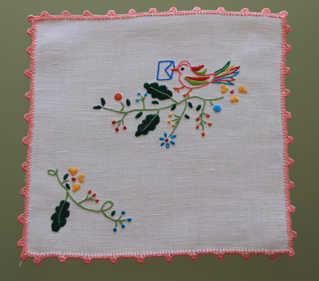 Marcador em pano de linho, bordada à mão, com motivos populares, remate em ponto croché em fio de algodão vermelho