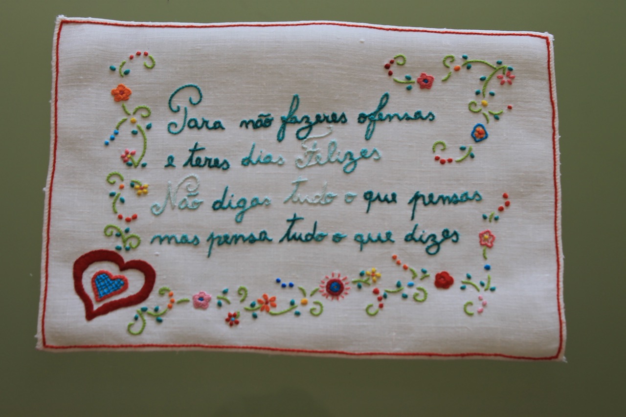 Pano de linho, bordado à mão, com quadra e desenhos populares, com remate em rolinho debruado a ponto pé de flor