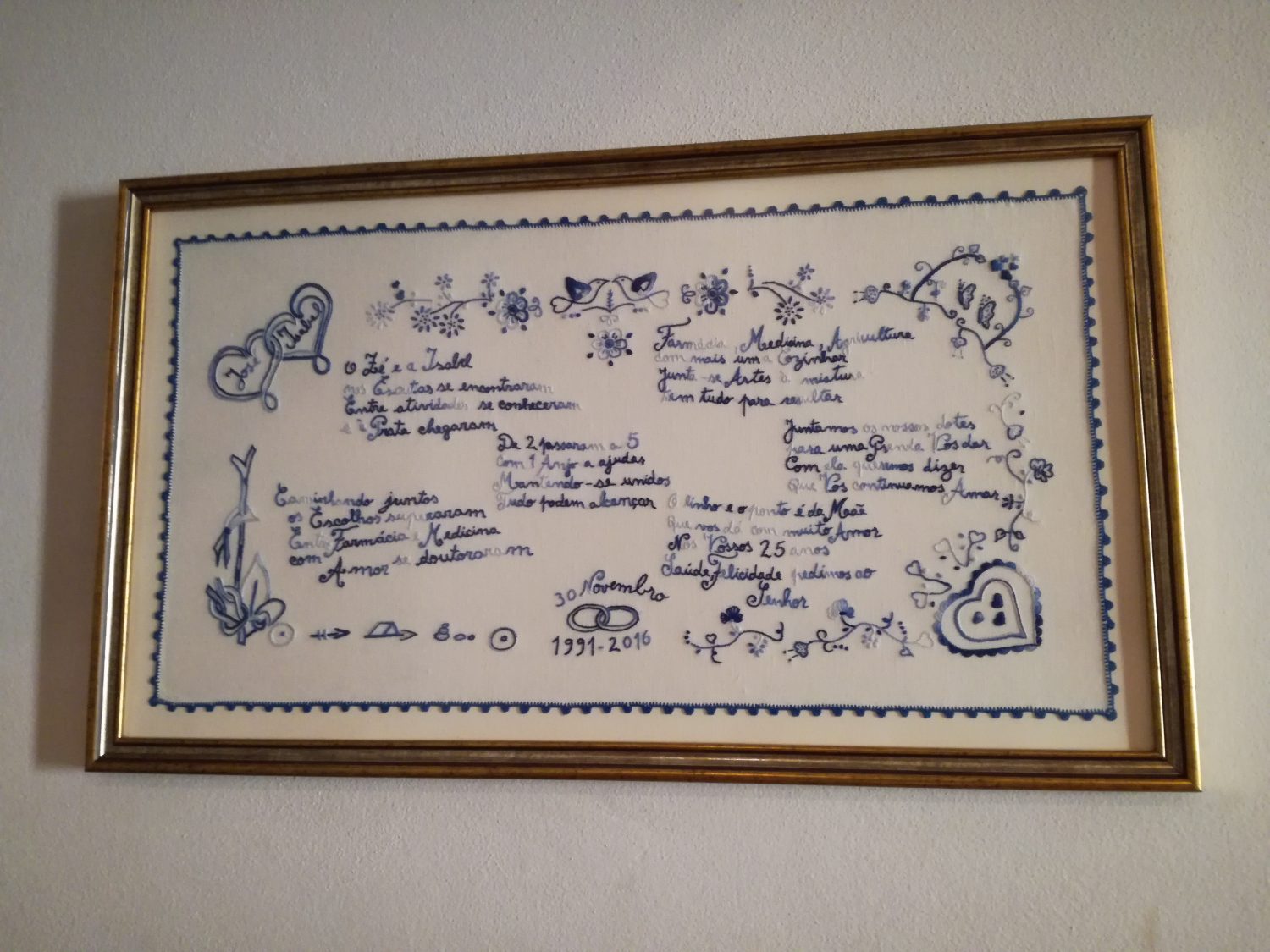 Pano de linho, bordado à mão, com quadras e desenhos personalizados, em celebração de aniversários, bodas de prata/ouro/diamante de casamento/socio/atleta, com remate em ponto de croché em fio de algodão