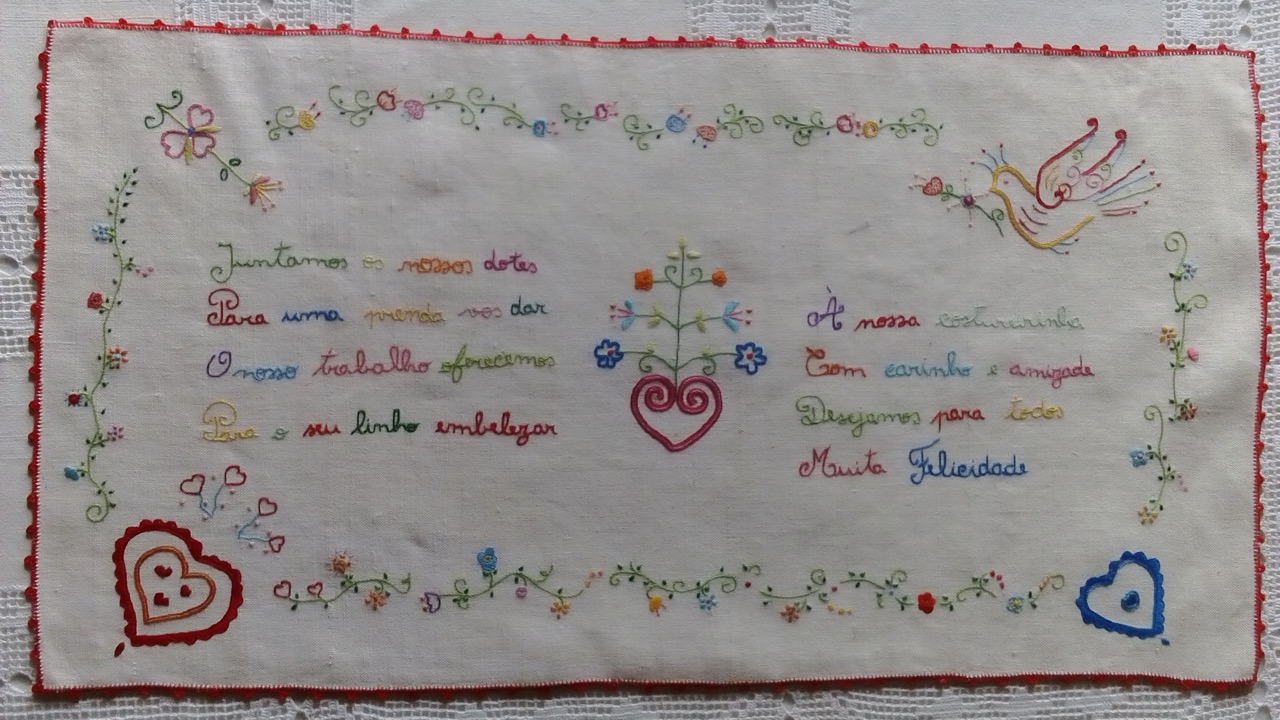 Pano de linho, bordado à mão, com quadras personalizadas e desenhos populares, para oferta personalizada.