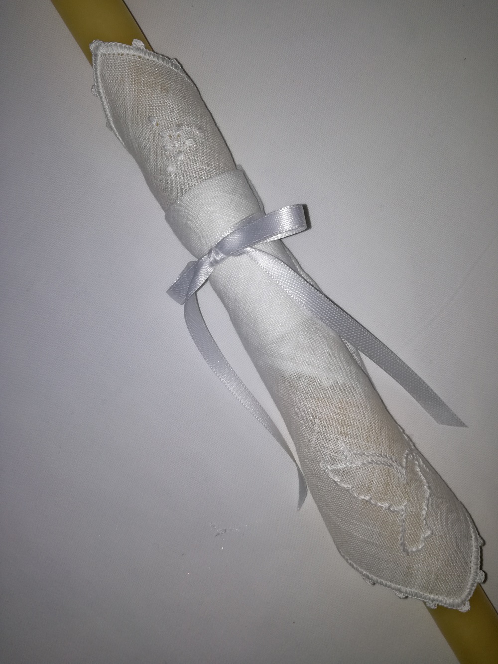 Lenço em pano de linho, bordado à mão e remate em ponto de croché